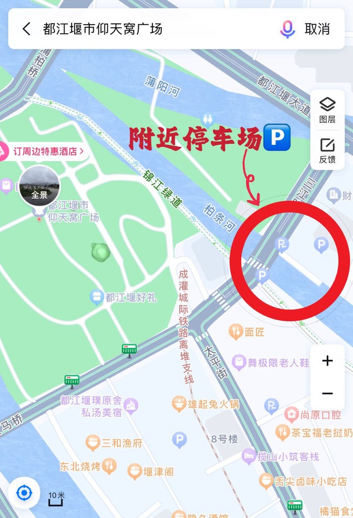 2、自驾不好停车,可一直驶过广场,在美食街那边停车方便,如图: