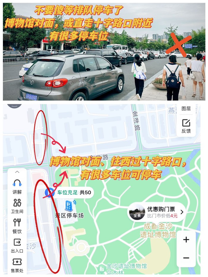 因为金沙遗址博物馆在成都市内,博物馆的停车场比较小,人多的时候停车需要排很久的队,我建议大家不用一直排队,博物馆对面有三个停车场都可以停,往西走过了十字路口(金沙派出所附近)有很多可以停车的位置,我们当天就是把车停在派出所外面路边的车位上,既方便又安全