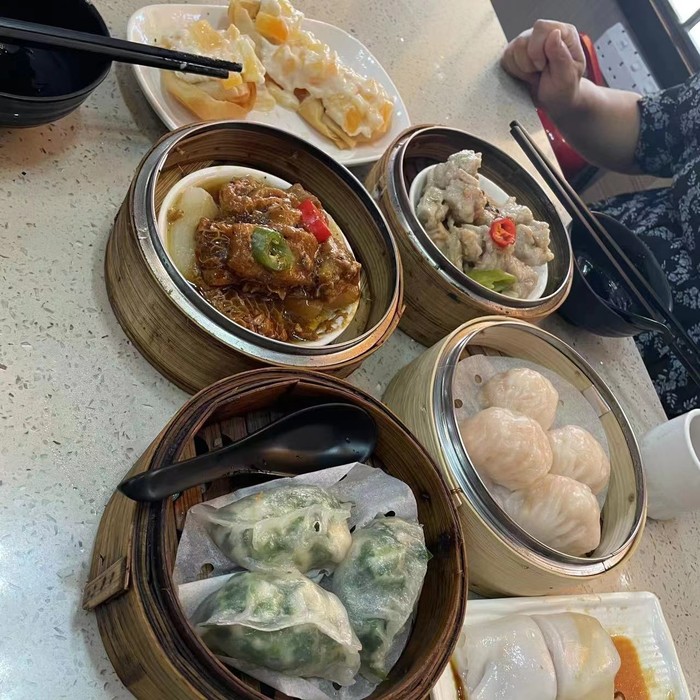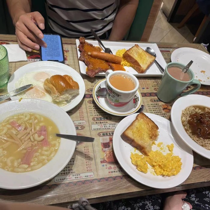 由于昨天一天都在忙活处理私事,原定计划今天上迪斯尼主题公园的,但查了一下天气有雨就取消了,结果第二天起来太阳巨晒,本想还按原计划前往迪斯尼,查了门票发票涨价了!!!(我就不懂了,这个公园票也有忙时和闲时的价吗?今天是周五大家不是都还在上班吗?反而昨天跟今天的票价就差了一百多),所以我们洗漱完就出发想去昨天看到在佐敦道的“红茶”餐厅、“新赞记”餐厅吃早中饭。“红茶”冰室也是当地比较有名气的网红店,但不能使用支付宝,要现金付款,因为我们是在中午十一点到店里,所以店里只供应早餐,三个人一共消费了一百三十多,感觉价格也还好。吃过“红茶”后,往前走了几分钟就到“新赞记”,这是一家吃港式茶点的餐厅(这里强烈推荐“新赞记茶餐”),在这里吃东西的都是这里附近的居民,价格也比较经济适中,味道也很不错。“红茶”餐厅也不错,但性价比没有“新赞记”餐厅高,由于我们才吃完“红茶”,本着走过不能错过的原则,所以就进到店了点了港茶经典的茶点:虾饺、鲜虾烧卖皇、双脆肠粉、虎皮凤爪、炸云吞、豆豉排骨等等,真的是扶墙进,扶墙出,给我们饱到要吐了。