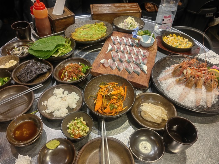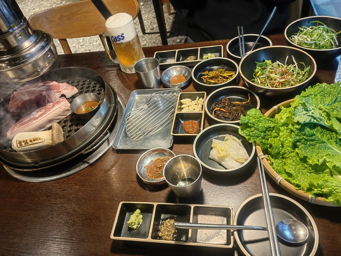 第二天赶紧住到了市里面,新罗免税店旁边,非常方便,楼下就是保健路,中午就在大众点评第一名的黑猪肉烤肉店吃上一顿美滋滋的烤肉,选的黑猪肉,一点都不腥