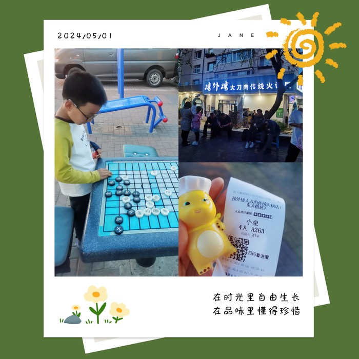 虽然楼外楼相对排队少一点,但也真是从天亮等到了天黑,路过公共象棋桌,皮皮跟姥姥还博弈了几盘,怎奈水平都有限,哈哈,主打一个欢乐就好