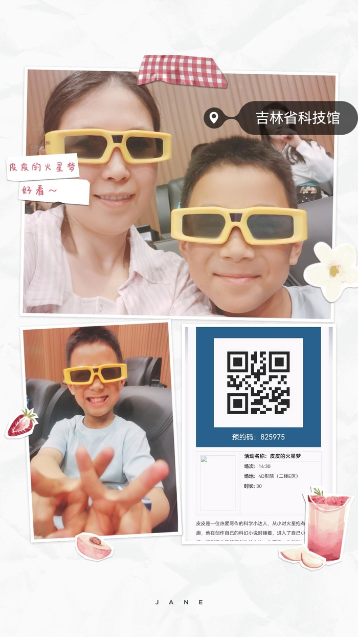进馆后才知道有很多体验项目和电影,都是有时间表的,尤其是电影,门票不多,要按指定的时间预约,我就定了闹钟,结果好幸运,约到的电影叫《皮皮的火星梦》,于是我就和皮皮一起看火星梦