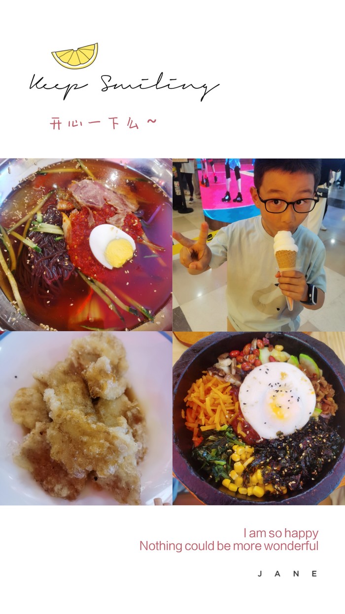 摩天轮下来简单吃了口韩餐,冷面、拌饭、安格斯肥牛、石板豆腐都挺好吃,好像还有什么菜,但是没拍照片就记不准了,哈哈,原谅我