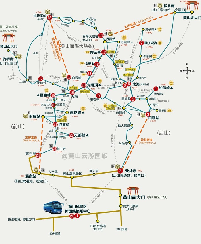 回到酒店整理背包,准备好上山物品,明早要把行李寄存在酒店,晚上提前预约好景区门票(190元/人)、云谷索道上行票(80元/人)和景区交通车票(19元/人),安排妥当抓紧休息养精蓄锐。这次小红书上“黄山云游旅行社”提供的导游地图对我帮助很大,此行也是借鉴了九条线路中的其中一条,有需要的朋友可以参考。