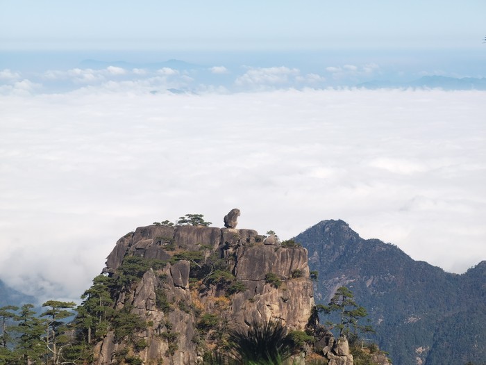 继续沿石阶向上,便能看到著名的奇石景观--猴子观海。形如灵猴蹲坐于峰顶,观云海起伏波澜不惊,因其面向黄山区,原为太平县,故又名“猴子望太平”。猴子为何要望太平呢?据说这里有个传说,我就不赘述了,传说是充满想象的,但不论怎样,表达的都是老百姓最美好的憧憬,这太平盛世如你我所愿。