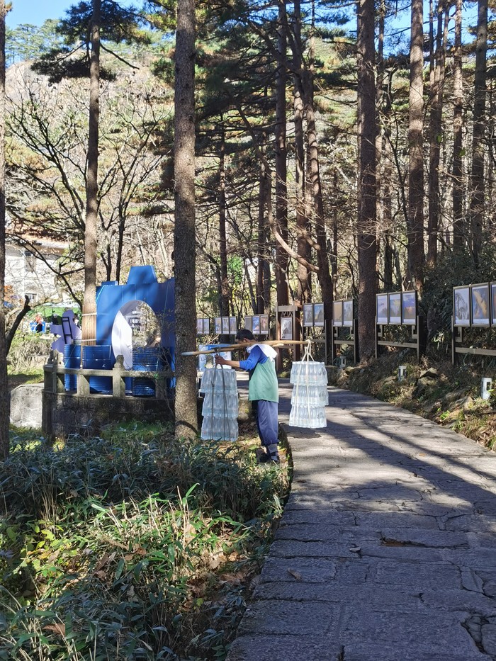 继续前行,经过团结松来到西海,山上有的酒店在装修,途中看到挑山工挑着瓷砖和大件装修框架,颤巍巍走着,偶尔用脖子上的毛巾抹一下脸,还有的挑着六大箱矿泉水,虽然有根木棍垫在肩头,我还是担心那根细细的担子能否禁得住这份沉重。对于他们不是怜悯而是尊敬,敬佩他们有这样的坚持,有这样的毅力,平凡而坚韧的人,为了生活辛苦付出,那些头发花白的挑山工,本应是安享晚年的年龄,却依然担着生活的责任,日复一日一步步前行,我们更应该珍惜当下,珍惜拥有的现在。