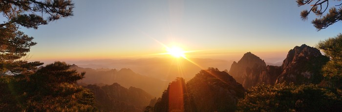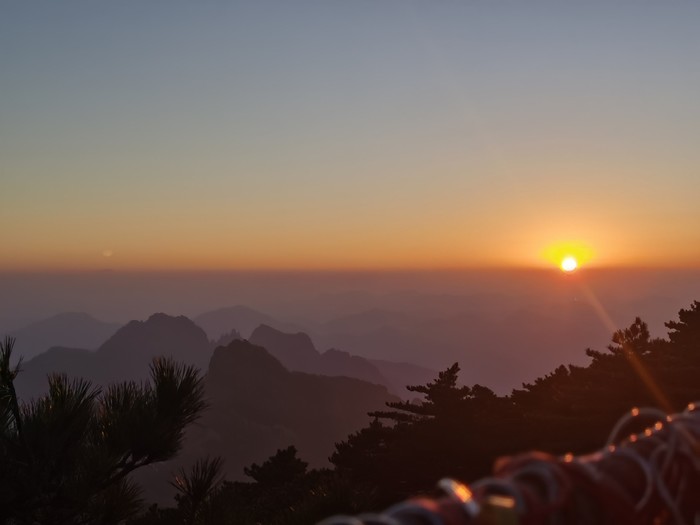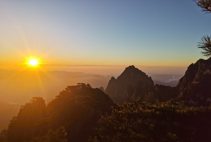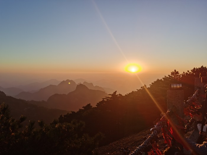 今天日出时间6点31分,看太阳一点一点酝酿能量,眼看着要将天边烧着了,随着光线越来越强,一轮红日喷薄而出,以势不可挡的力量迸发出耀眼的光芒。新的一天,从黄山日出开始……