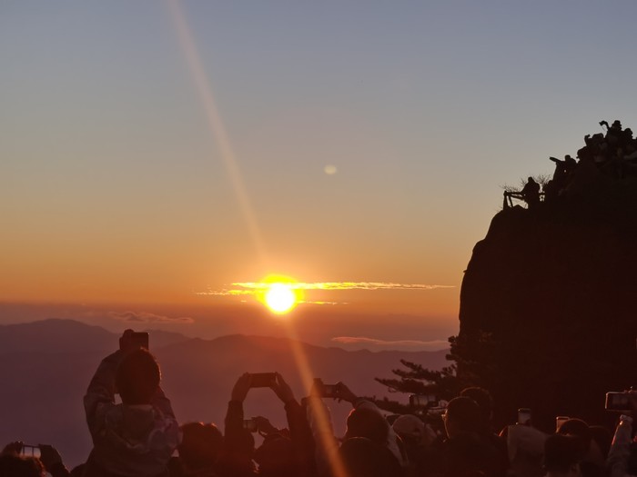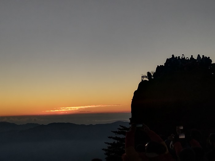 12日早5点半出发,穿上羽绒服,再套上宾馆的防寒服,拿着手电,趁着夜色出发,二上光明顶。一路上都是同行的人,6点到达光明顶一看,已被各大门派占领,好位置没有了,只能在夹缝中求生存。