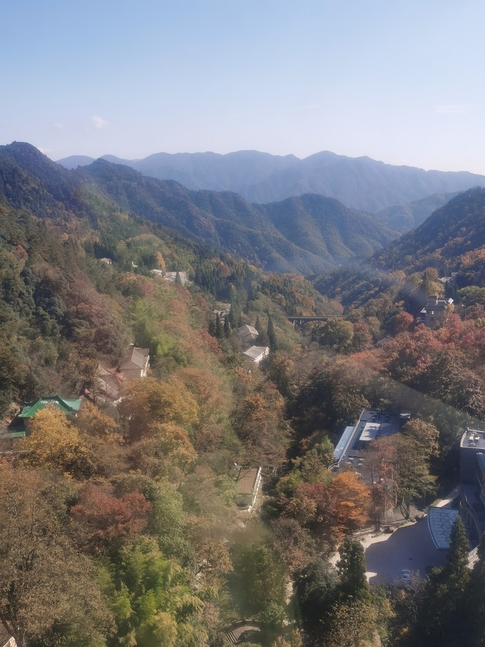 放弃了挑战天都峰,来到玉屏索道(90元/人)乘缆车下山,正值中午12点,下山人少,难得只有我们两人坐一个缆车,在层林尽染间来到山下。