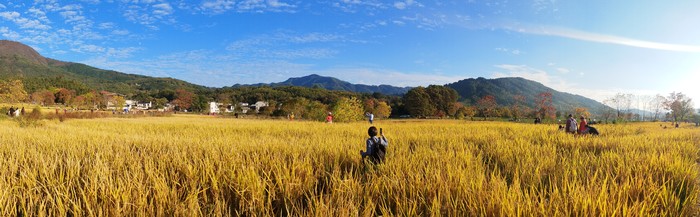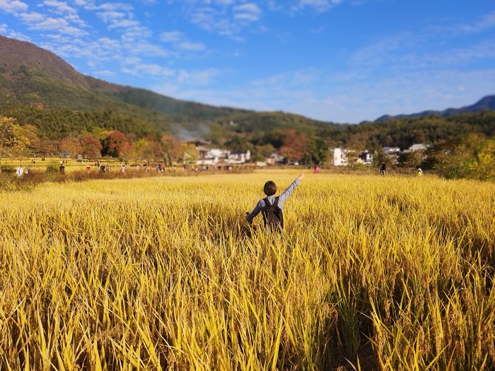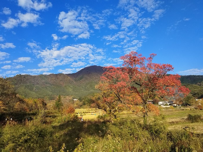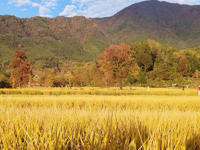 塔川未收割的稻田,金灿灿的像不像梵高的油画《丰收》?蓝天映衬着金黄的土地,悠悠白云点缀其中,袅袅炊烟缓缓升起,树叶有黄、有绿、有红,层层点缀,如同置身于世外桃源,抛开一切烦扰,只想捧起被压弯了腰的稻穗。