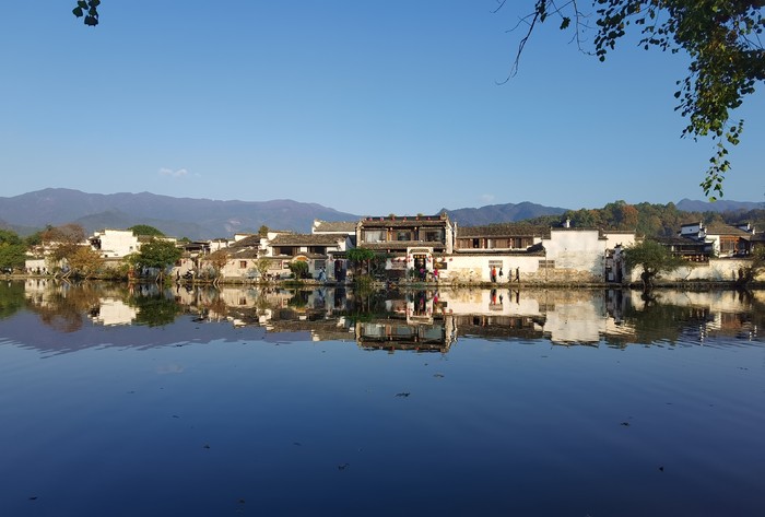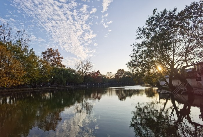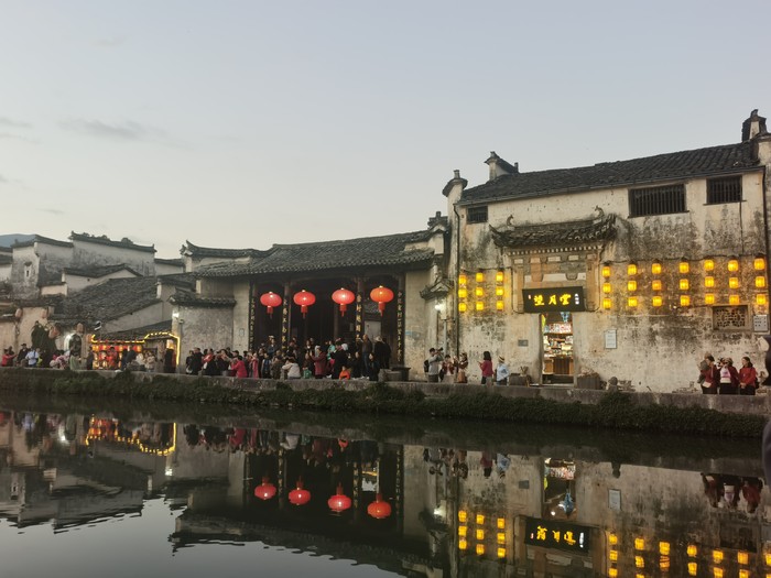 夕阳西下,南湖逐渐黯淡下来,月沼周围的灯火点亮,宏村的夜刚刚开始。