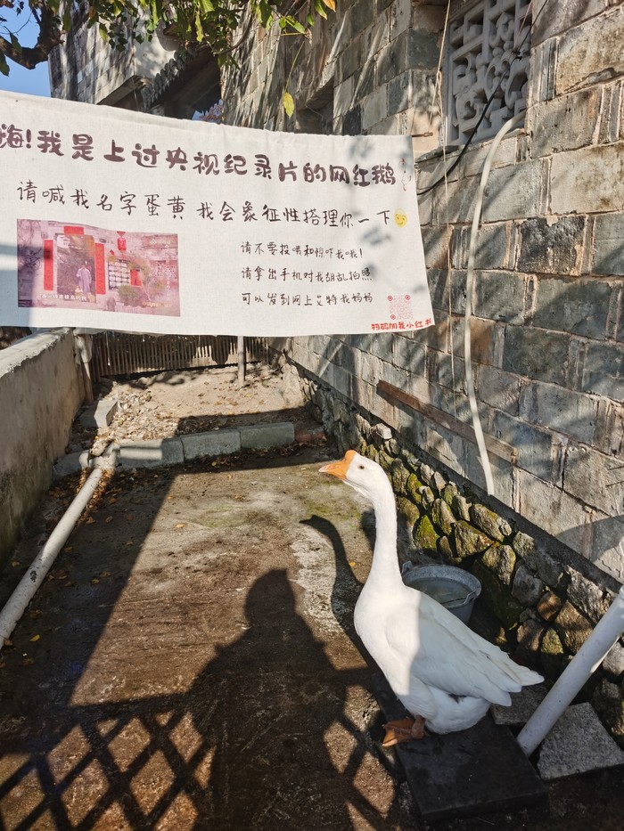 宏村的南湖书院、志远堂、宽和堂、傍云堂、椿和堂、承志堂,这些建筑都已记录在我《自由行走之初见黄山》的游记里,这里就不重复介绍了。有趣的是,这次逛着逛着发现了一只网红鹅,名字叫蛋黄,只要你叫:蛋黄 蛋黄,它会答应:额,额,额。有视频为证,拽拽的可爱。