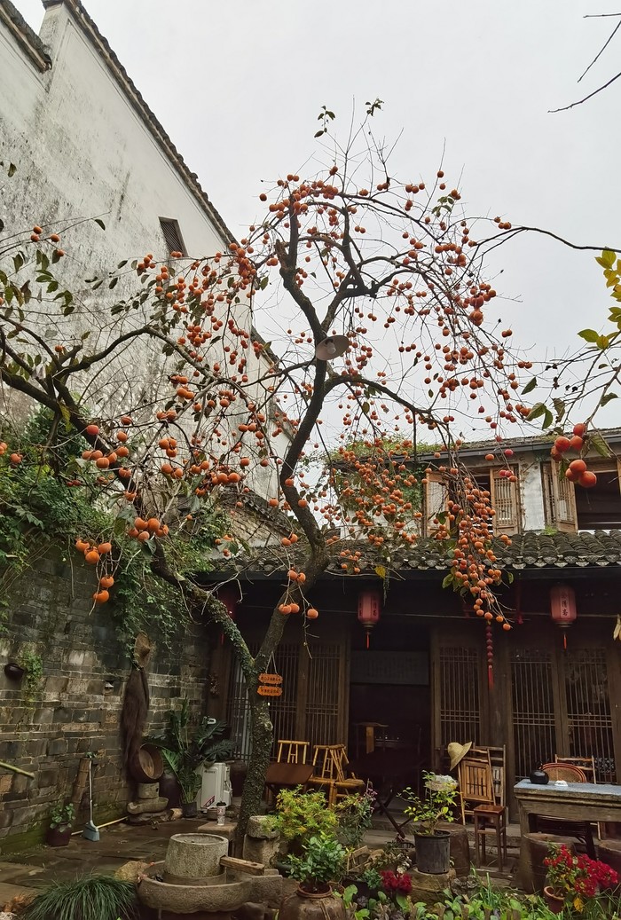 继续往小巷深处走,有很多新兴民宿,小桥流水人家,古朴安静。院子里的柿子缀满枝头,一片橙红映照在白墙黛瓦。