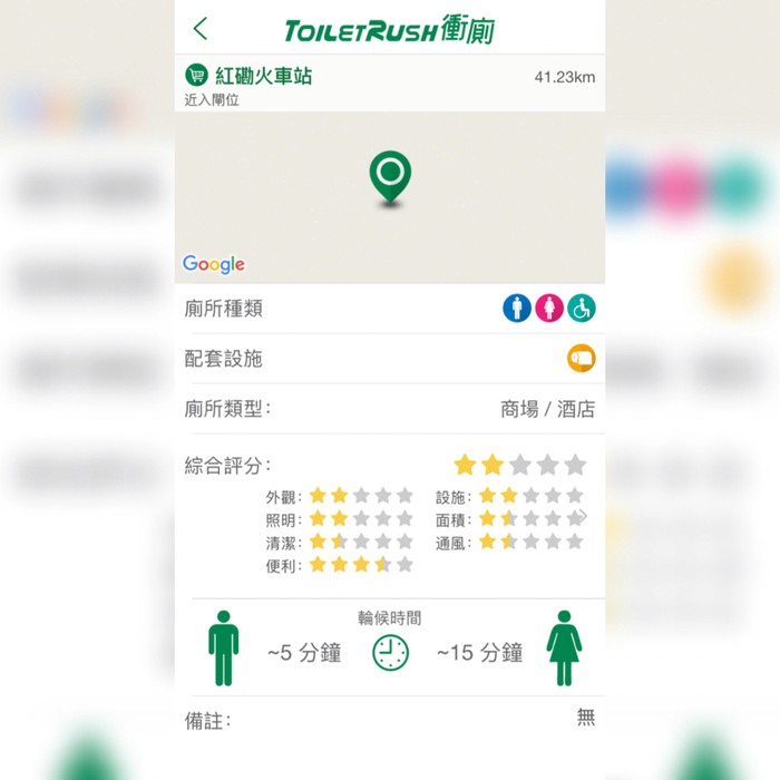 人生大事,正是如厕。冲厕是一款利用GPS定位。寻找你附近厕所位置的程式。更提供厕所评级,如照明、清洁、设施和面积,更有最重要的通风评级。而最贴心的是有厕所轮候时间,要知道女厕往往大排长龙,用这个App就可找到没有人排队,找个喜欢的厕所舒服一下啦。
