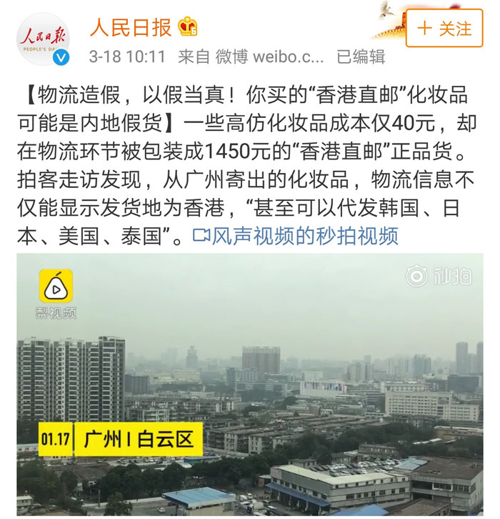 3月18日,@人民日报 曝光了一则与物流信息造假的新闻,引发了众多女生的惊慌。一些高仿化妆品成本仅40元,却在物流环节被包装成1450元的“香港直邮”正品货。