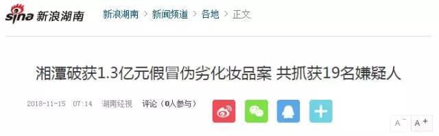 去年11月15日,新闻报道湘潭市食品药品监督管理局联合湘潭市公安局雨湖分局成功破获特大生产经营假冒化妆品案。货值金额达1.3亿元左右。